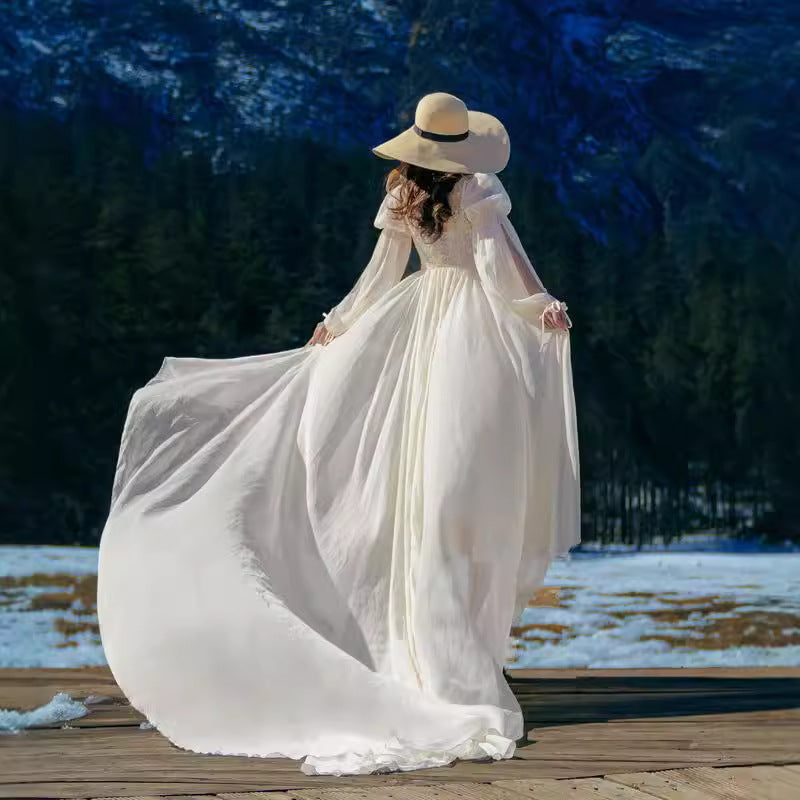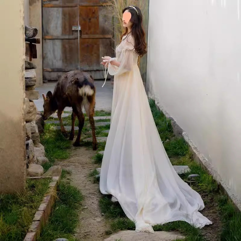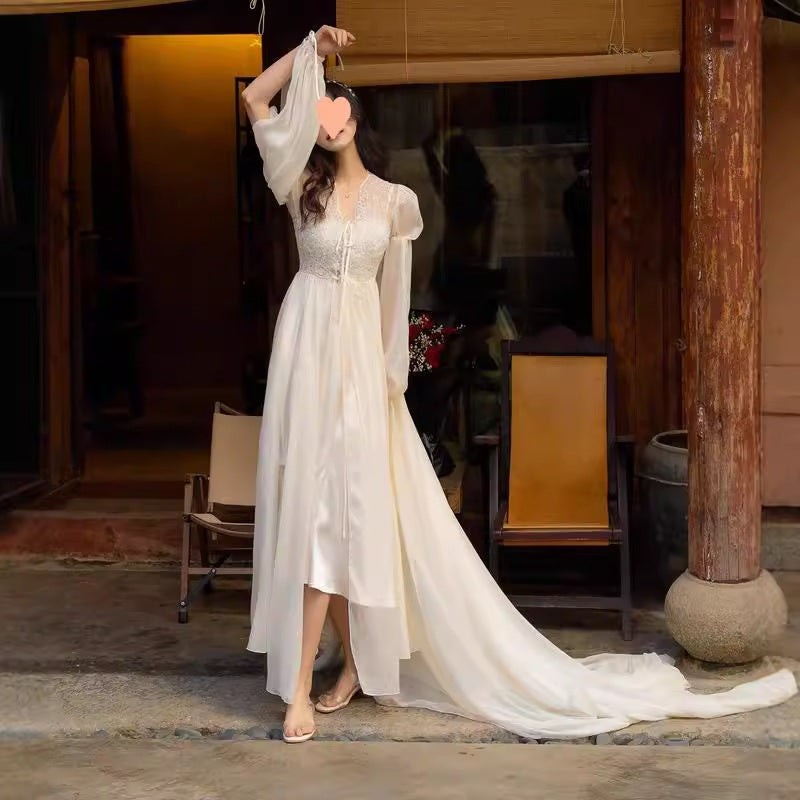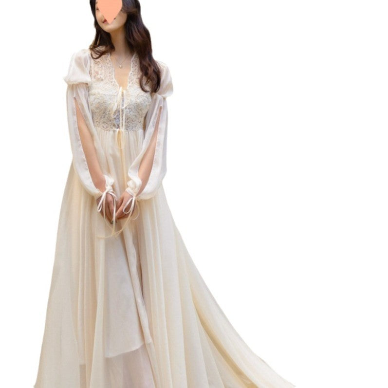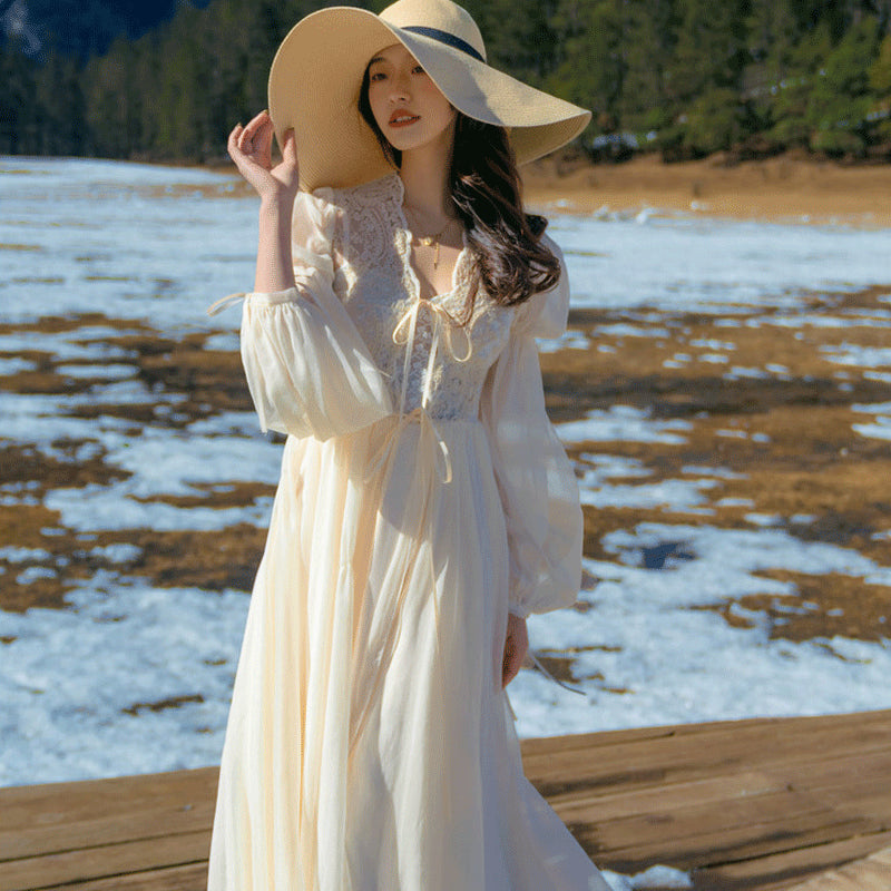 Retro Lace Long Tail Dress with Bubble Sleeves