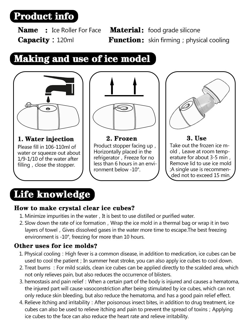 5. Easy operation: You just need to add water to the mold and place it in the freezer,waiting for several hours,you will get a good ice cube to massage your skin.