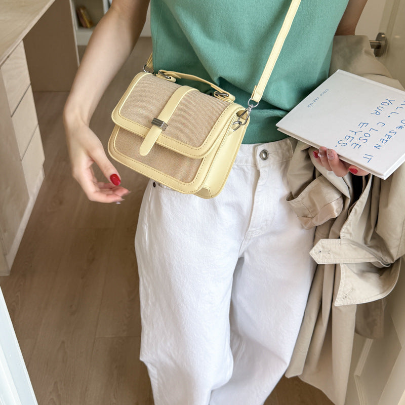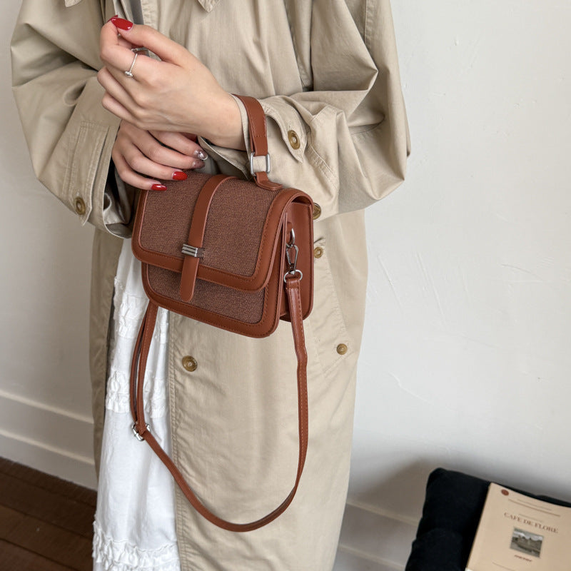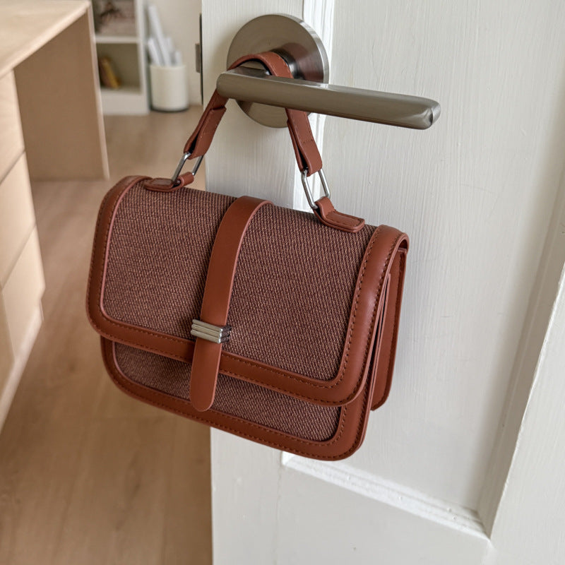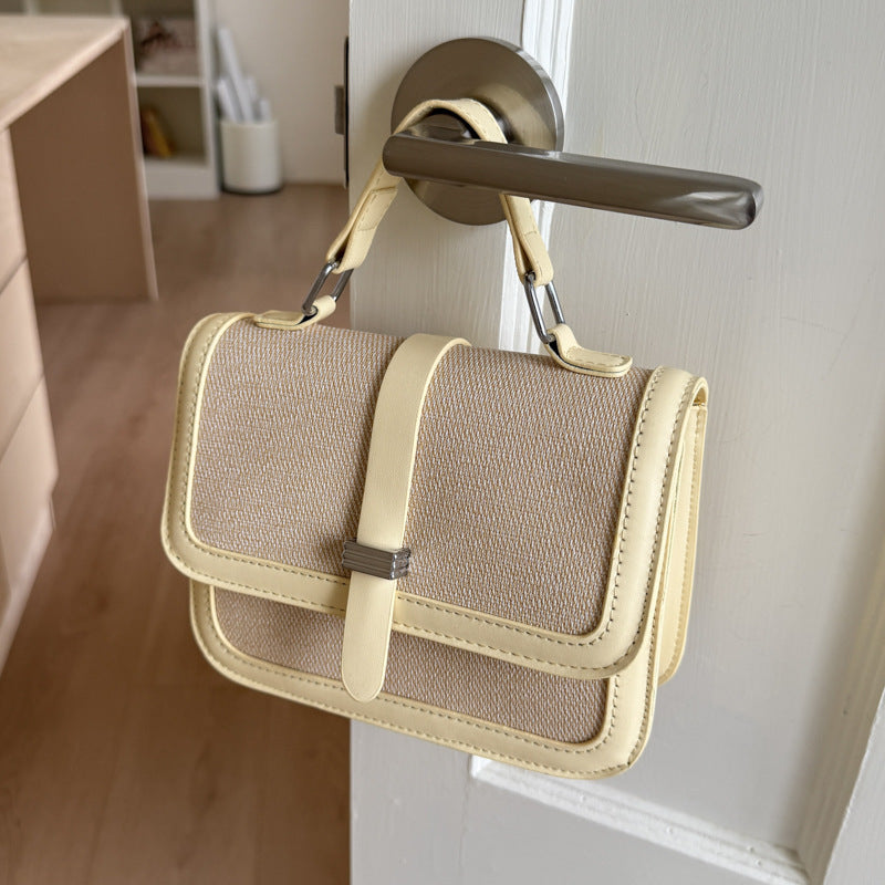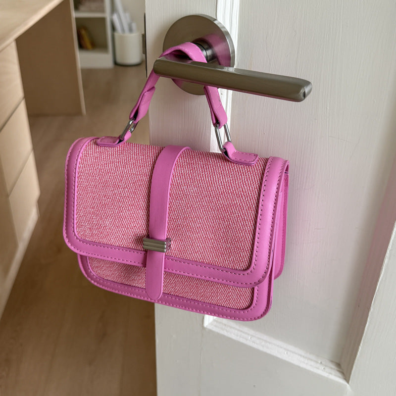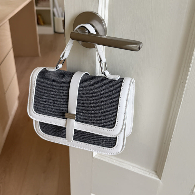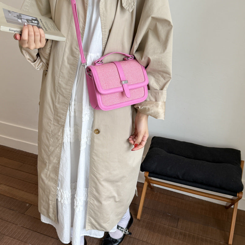 A square box handbag paired with thin-heeled pointed-toe sandals for women by Glamytek