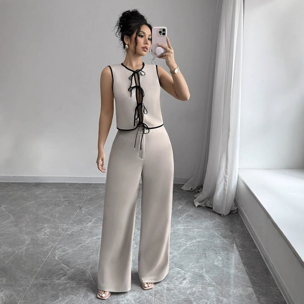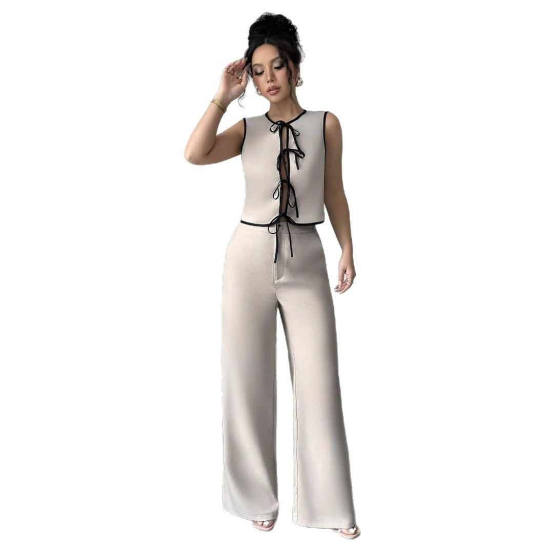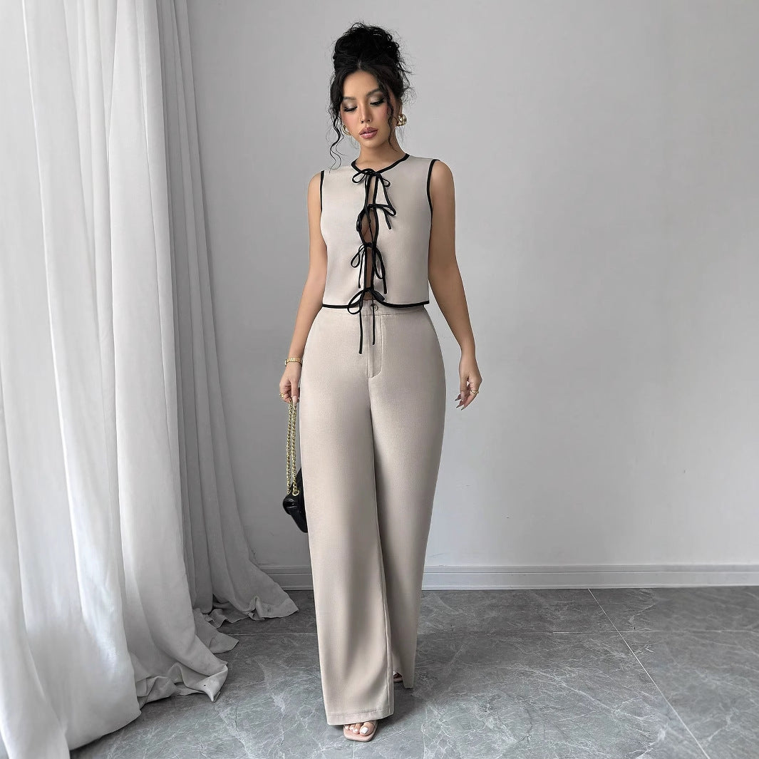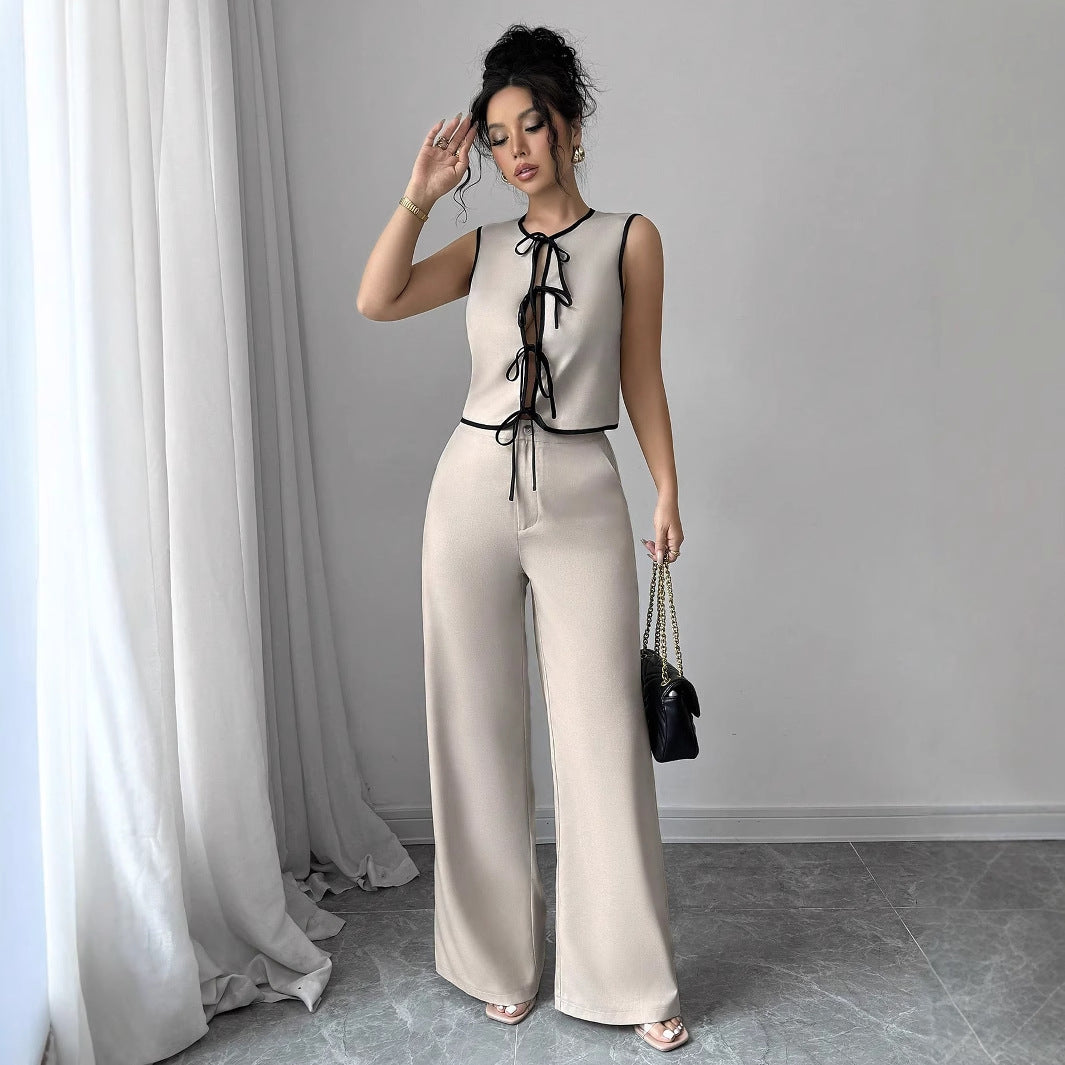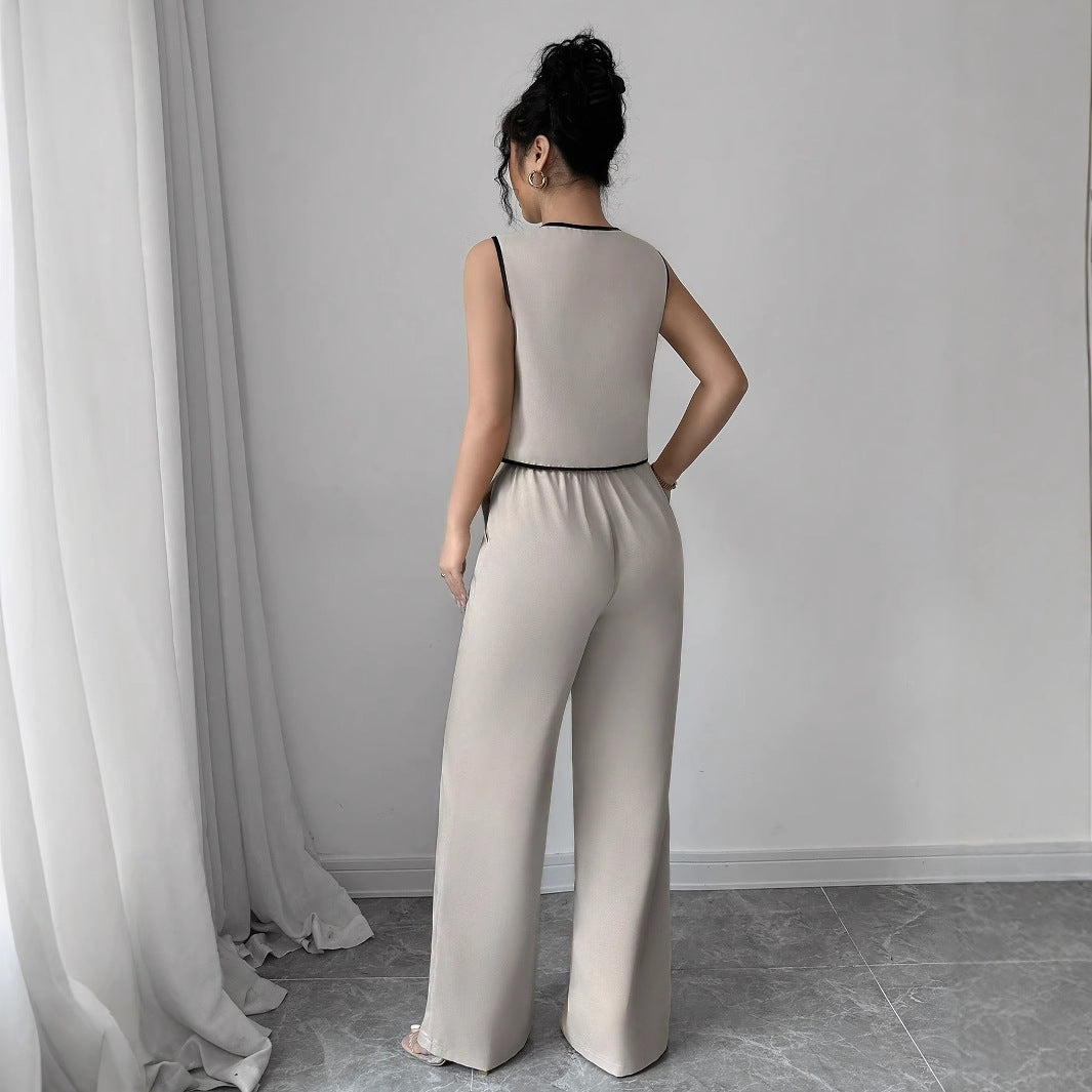 Elegant Design: Features a high-waisted wide-leg pants and sleeveless vest set for a stylish look.