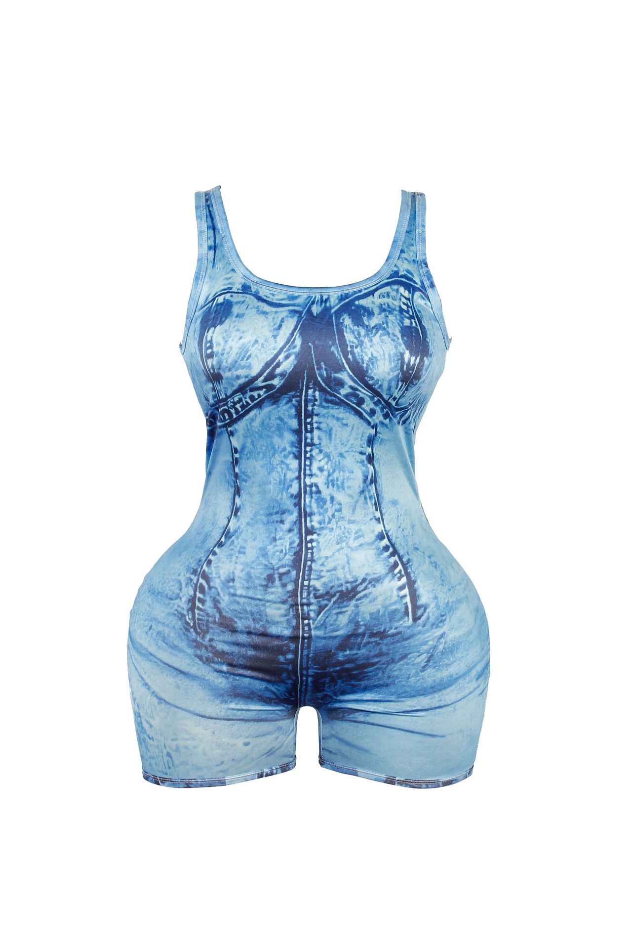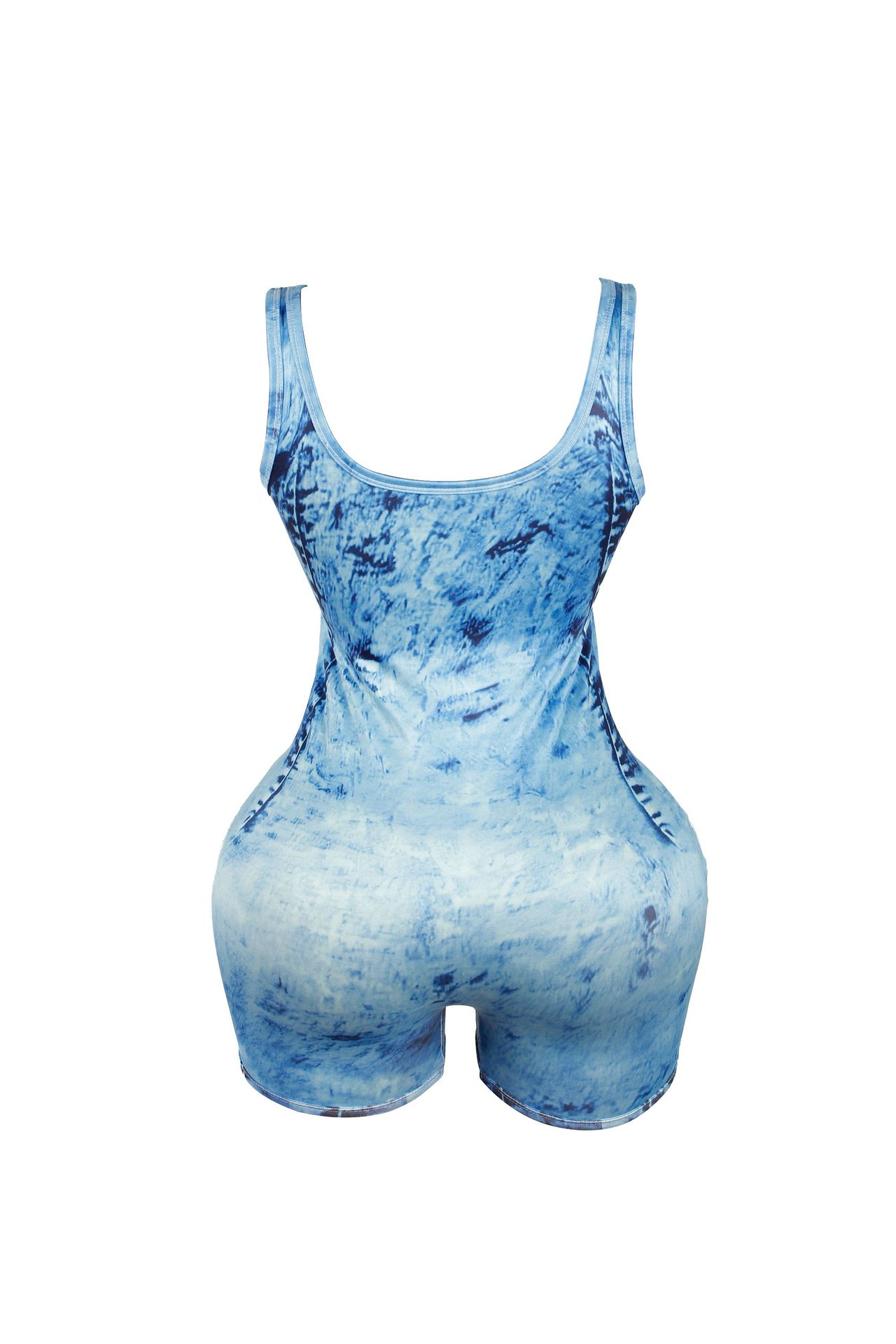 Fashion Denim Print Backless Jumpsuit Shorts.