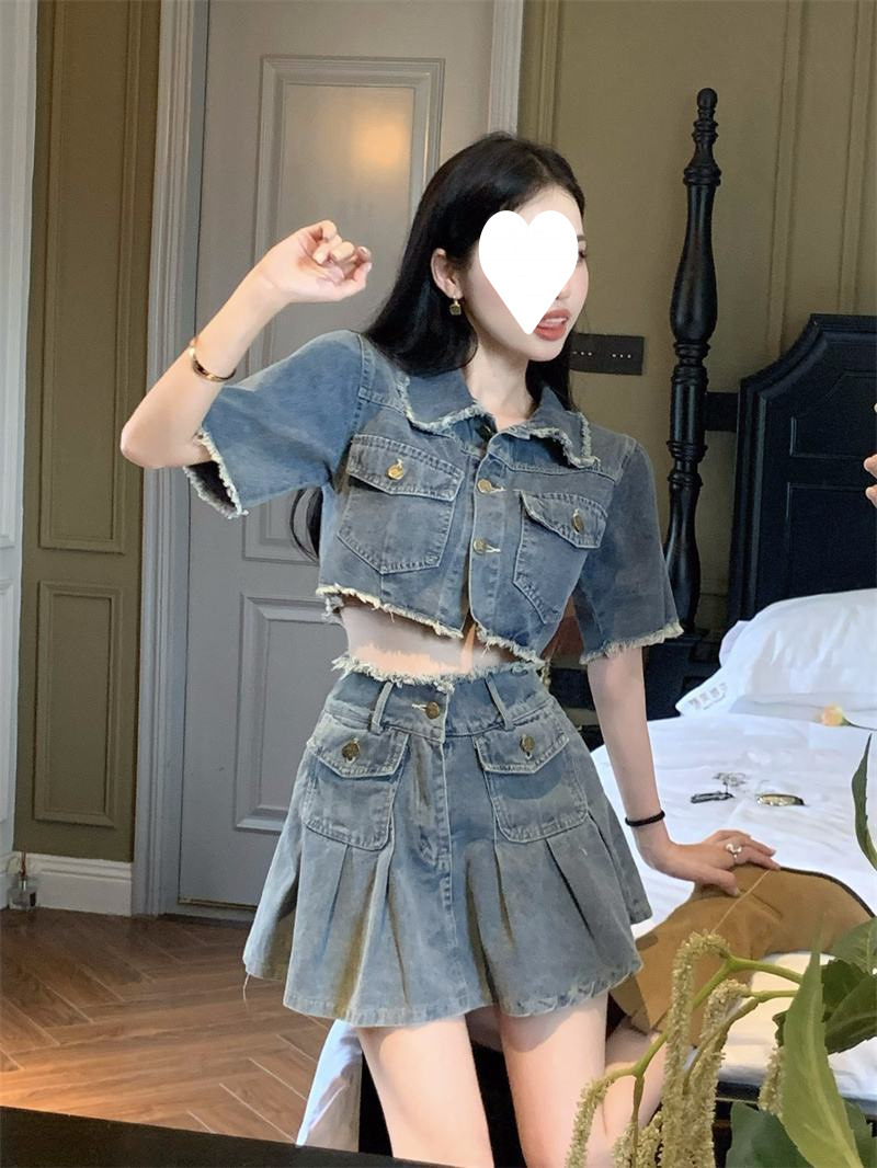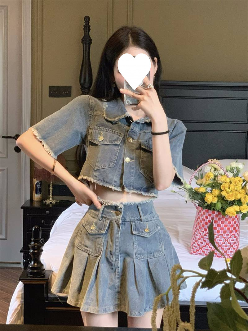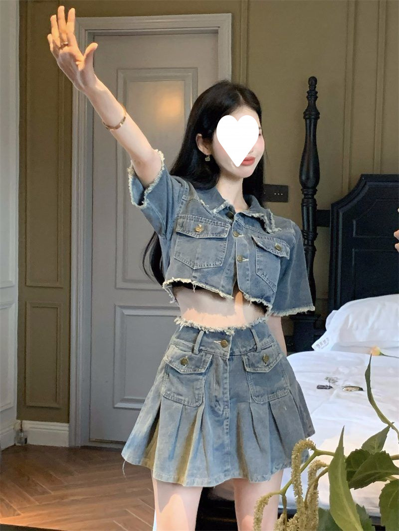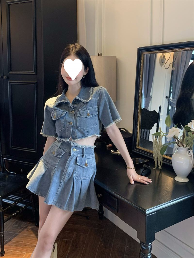 Two-Piece Set: Includes a short denim shirt and high-waist skirt for a complete outfit.
