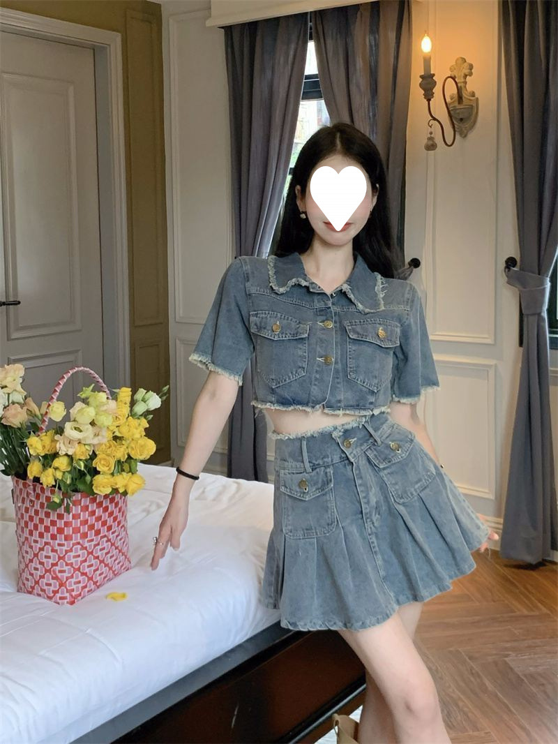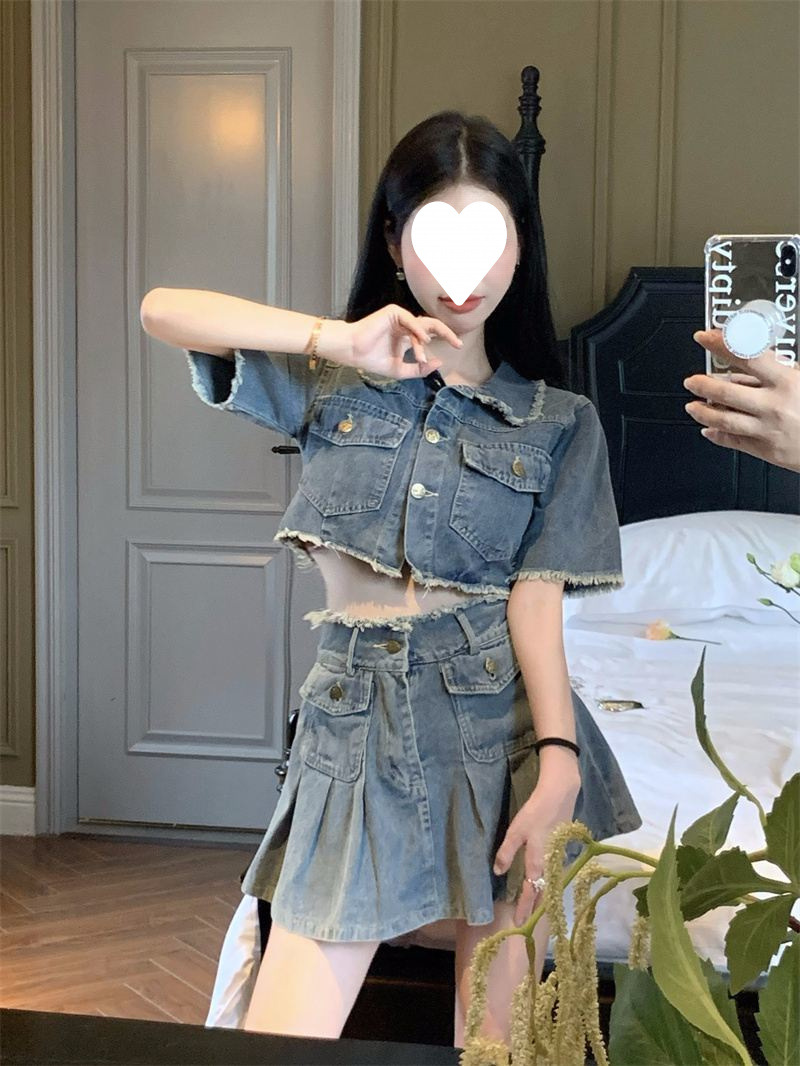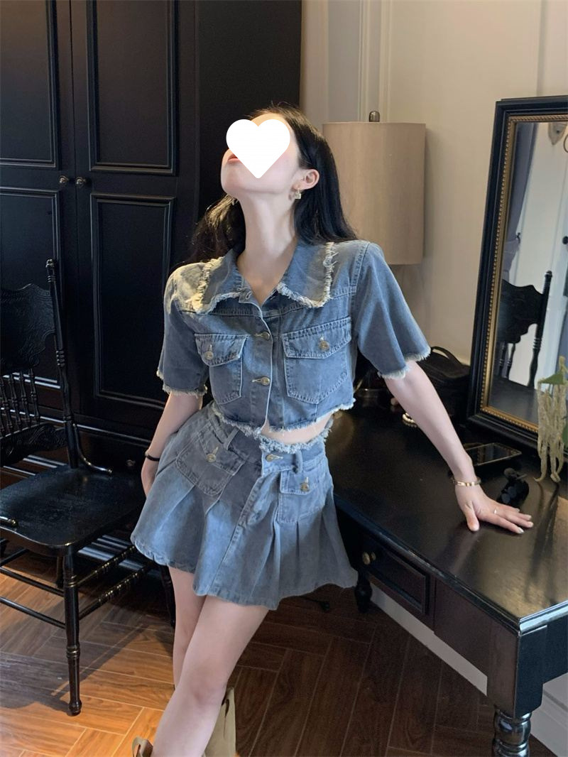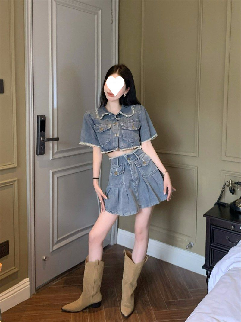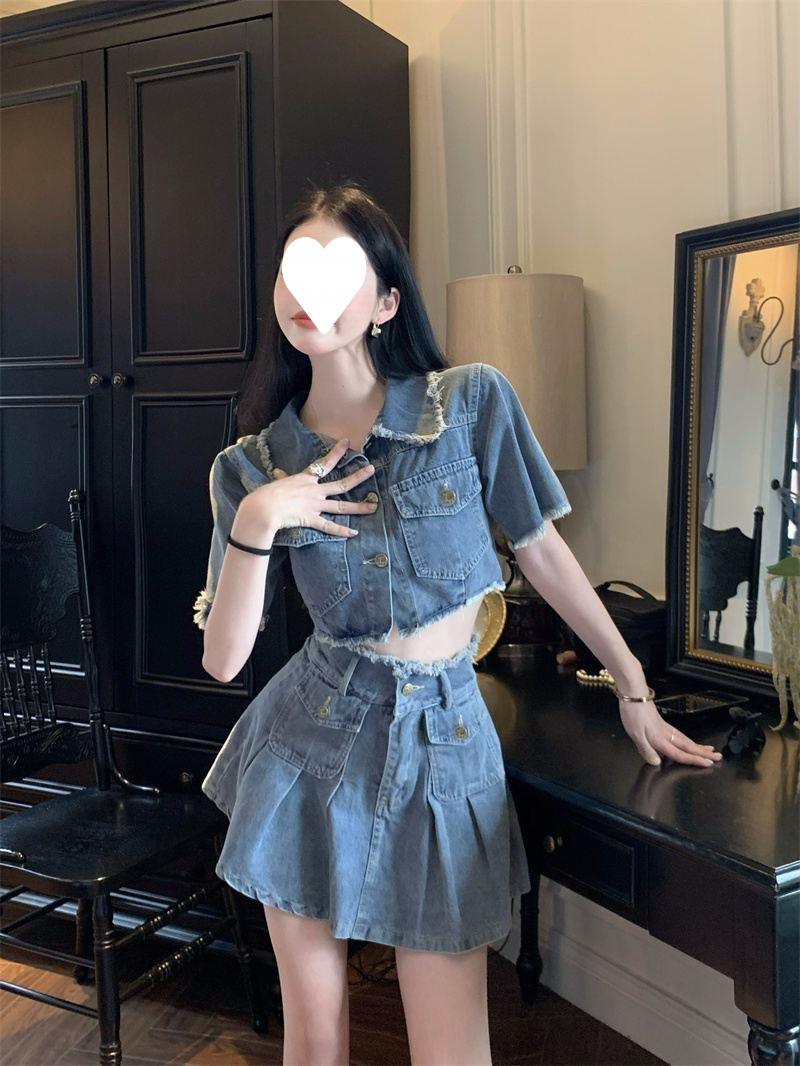 Two-Piece Set: Includes a short denim shirt and high-waist skirt for a complete outfit.